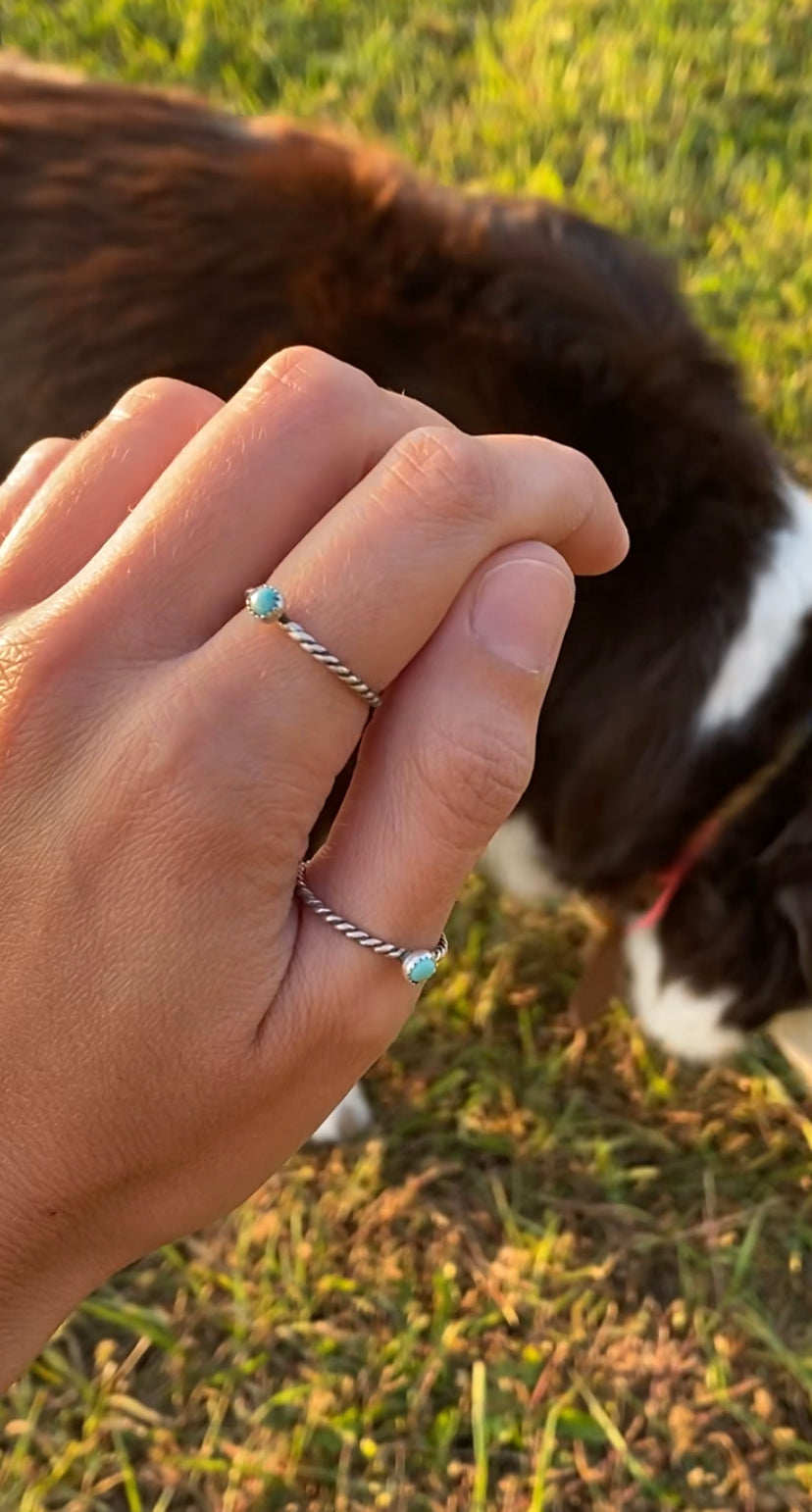 This dainty turquoise ring is handmade in your size, made with authentic turquoise and a solid sterling silver rope band. Perfect to wear alone on any finger or stack with your favorite rings!